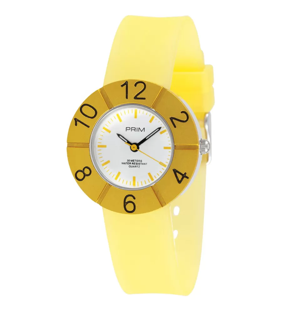 Neobvyklé dětské náramkové hodinky značky Prim budou ideální pro děti, které mají už odmalička svůj vytříbený styl. Hodinky mají kulaté pouzdro ze slitiny s okružím, na kterém jsou sudá arabská číslice a bílý ciferník má už jen žluté indexy. Řemínek je silikonový a je v zářivé žluté barvě.