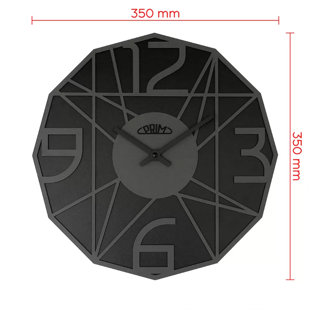 Nástěnné dřevěné hodiny PRIM Glamorous Design v netradičním tvaru. Výrazným prvkem jsou číslice v 3D provedení. Varianta 5390 má ručku z kvalitní dřevěné dýhy. Hodiny jsou vybaveny strojkem s plynulým chodem, u varianty 9000 jde o strojek krokový. Jsou zpracované z polotvrdé dřevovláknité desky (MDF). Tloušťka obou vrstev MDF je 6 mm (jedna vrstva 3 mm). Vyrobeny v ČR. Rozměry hodin jsou 350 x 39 mm, sou napájeny jednou tužkovou baterií AA.