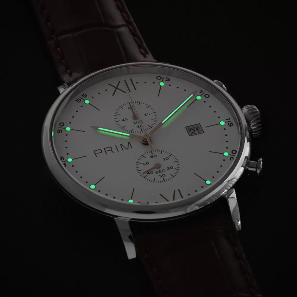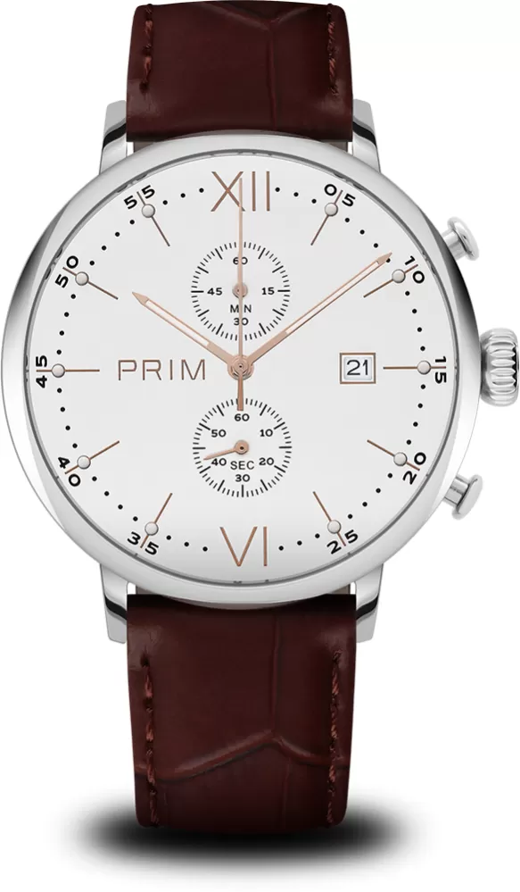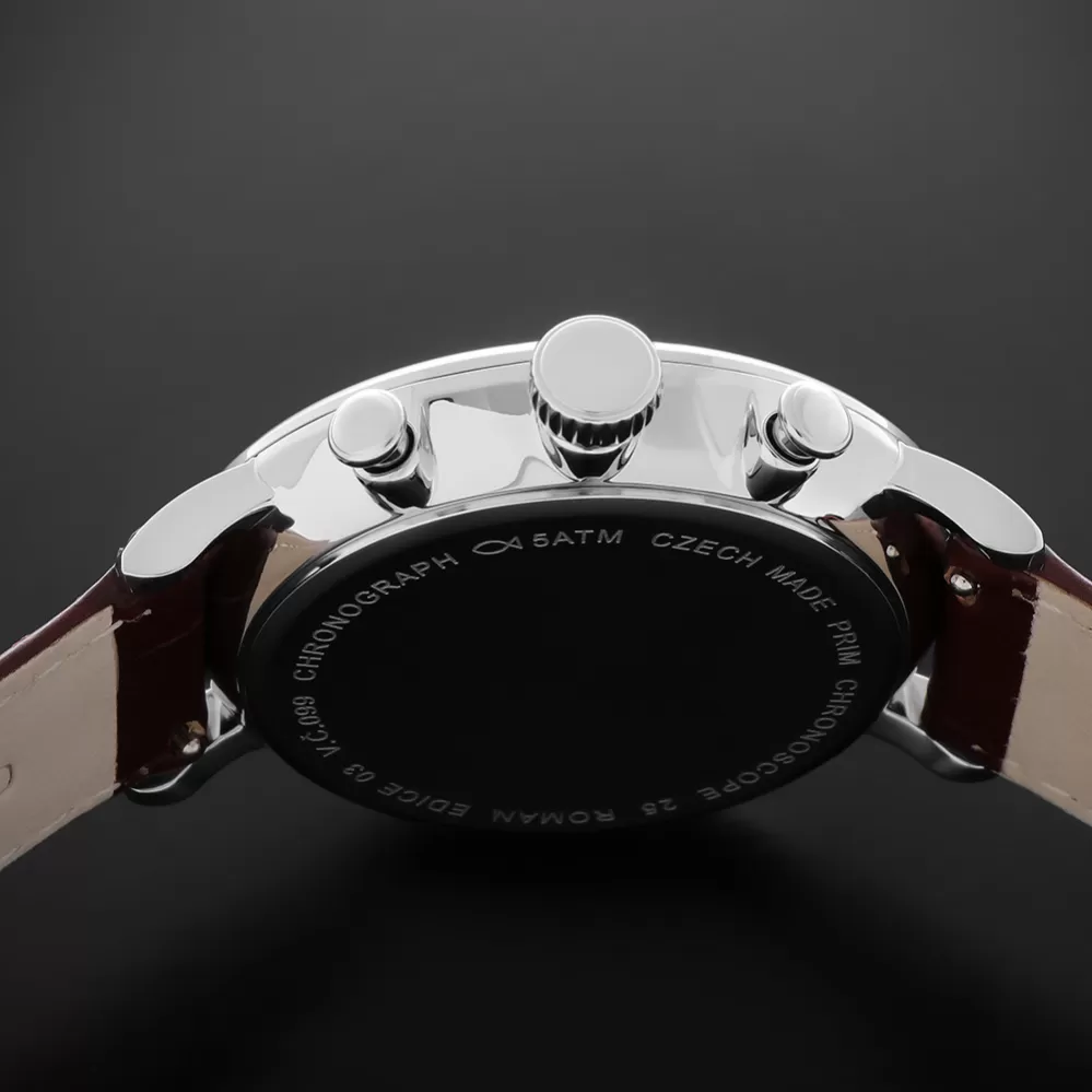 PRIM Chronoscope 25 Roman jsou elegantní hodinky s chronografem, které kombinují společenský styl s minimalistickým designem. Jejich vzhled vychází z Bauhaus stylu a zdobí je tištěné indexy s jemnými luminiscenčními prvky. Luminiscenční body na indexech a nátěr na ručičkách zajišťují snadnou čitelnost i za šera. Hodinky pohání japonský quartzový strojek OS11, který je spolehlivý a přesný. Ochranu ciferníku zajišťuje kvalitní dvojitě klenuté safírové sklíčko s antireflexní úpravou. Díky tomu jsou hodinky odolné a mají dlouhou životnost. Celkově tak představují ideální spojení elegance a funkčnosti.