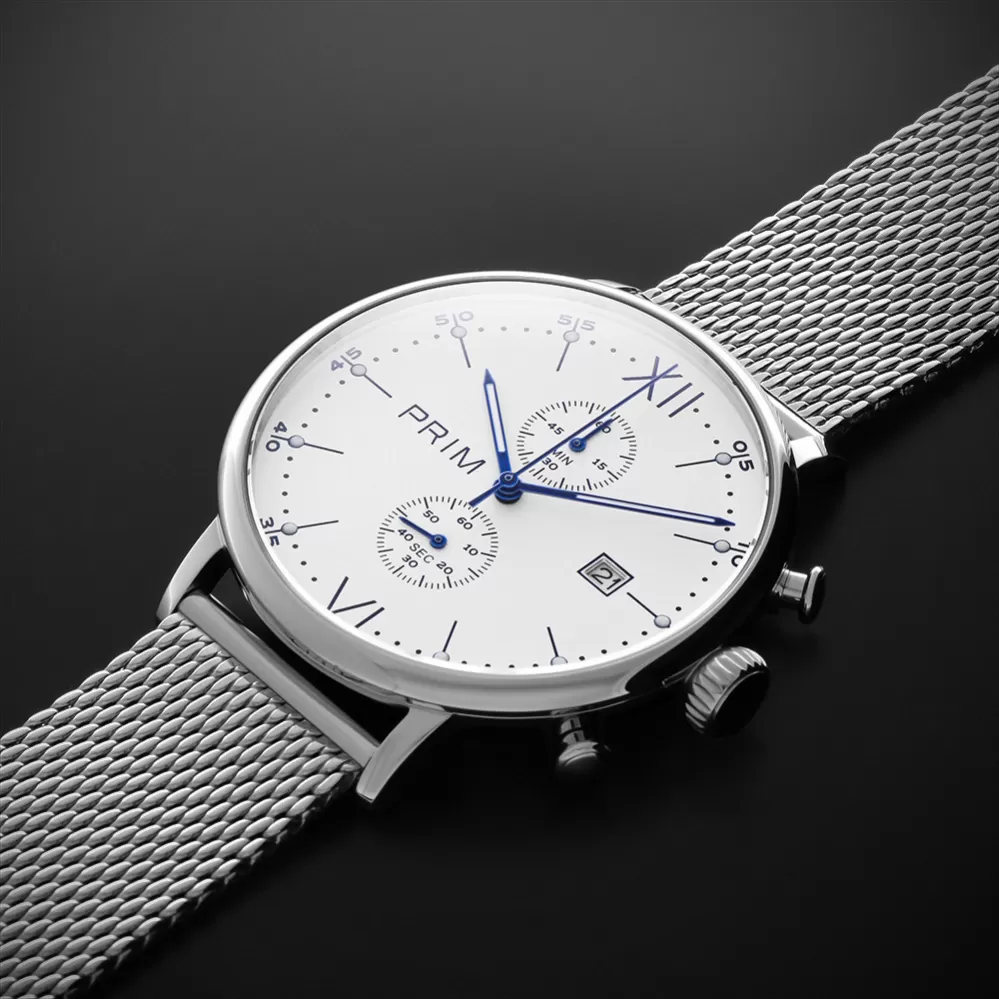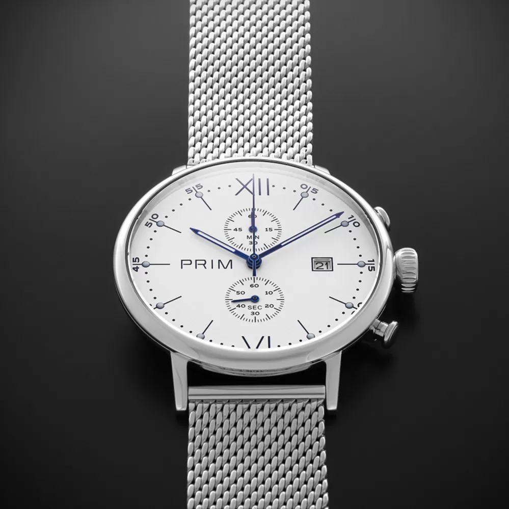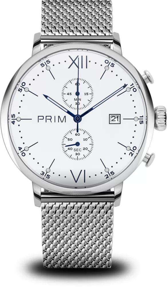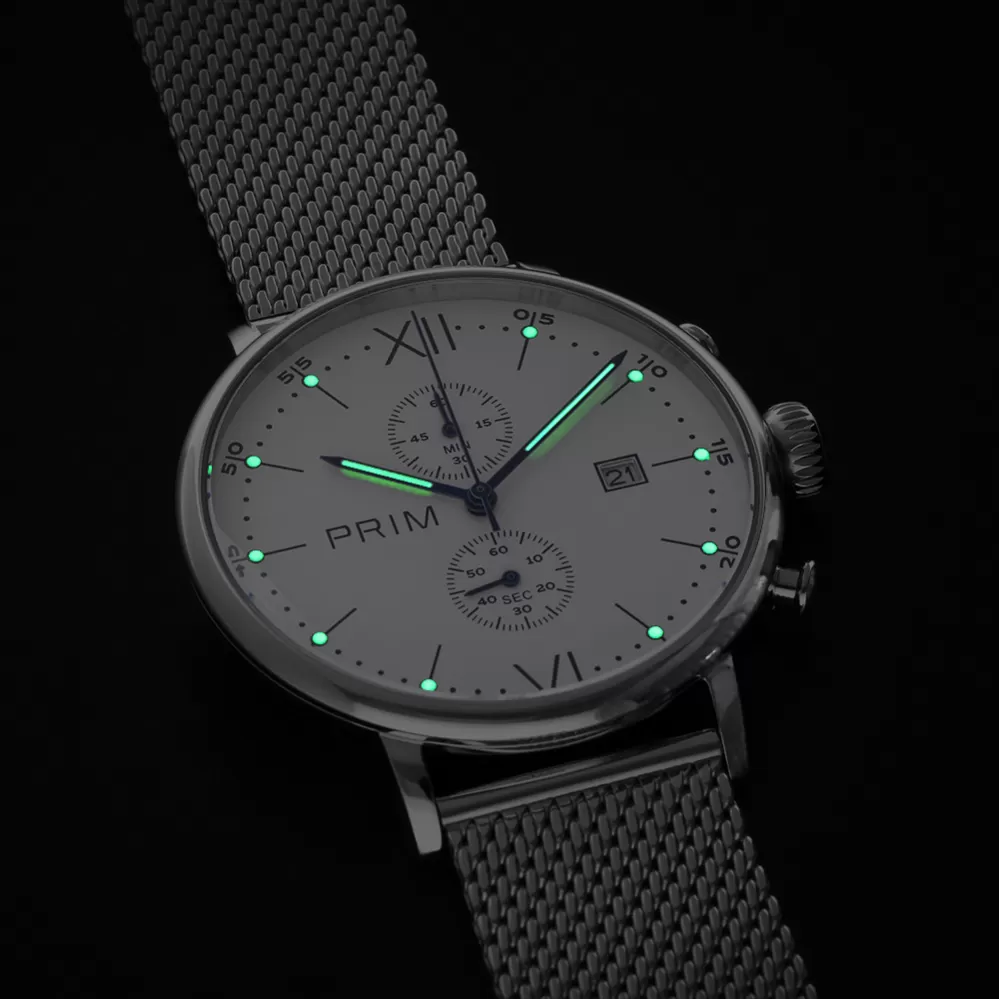 PRIM Chronoscope 25 Roman jsou elegantní hodinky s chronografem, které kombinují společenský styl s minimalistickým designem. Jejich vzhled vychází z Bauhaus stylu a zdobí je tištěné indexy s jemnými luminiscenčními prvky. Luminiscenční body na indexech a nátěr na ručičkách zajišťují snadnou čitelnost i za šera. Hodinky pohání japonský quartzový strojek OS11, který je spolehlivý a přesný. Ochranu ciferníku zajišťuje kvalitní dvojitě klenuté safírové sklíčko s antireflexní úpravou. Díky tomu jsou hodinky odolné a mají dlouhou životnost. Celkově tak představují ideální spojení elegance a funkčnosti.