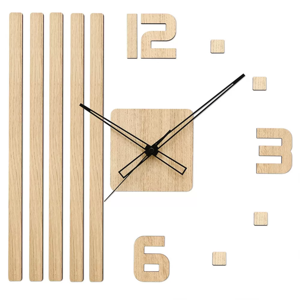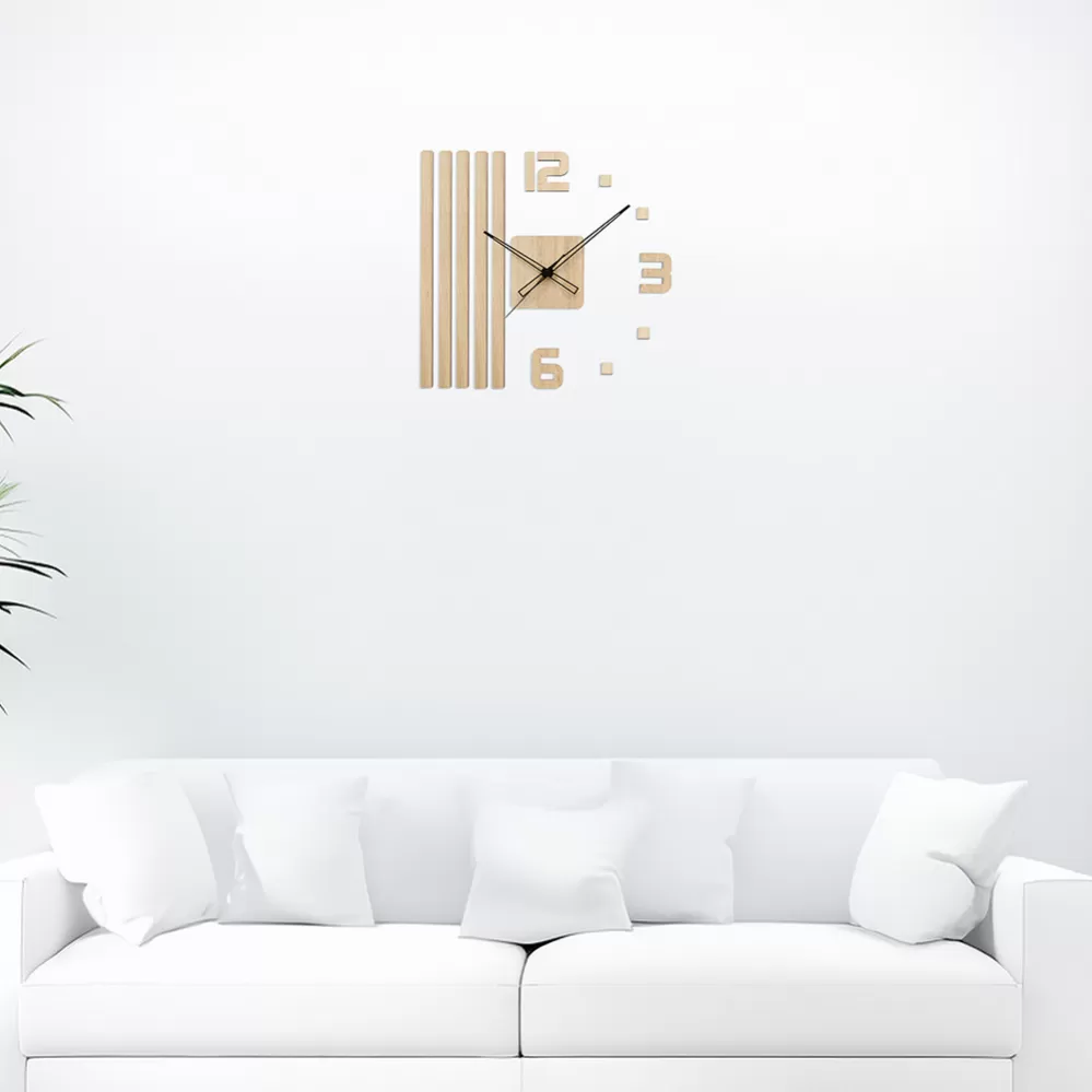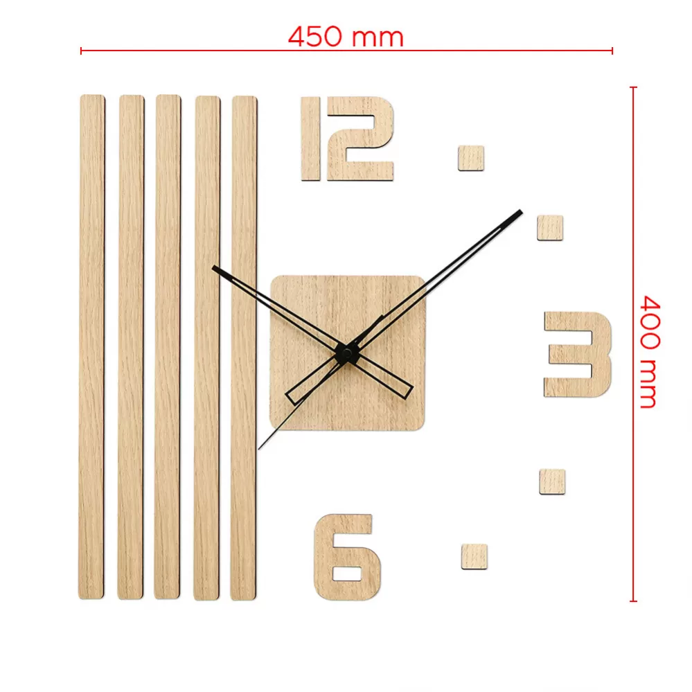 Supertiché designové nástěnné nalepovací hodiny s netradičně pojatým číselníkem. Tyto hodiny jsou opravdovou lahůdkou pro milovníky moderního minimalistického designu. Zatímco pravá strana číselníku kombinuje precizní spojení vyřezávaných arabských číslic s indexy, ta levá je ponechána čistá. Tím hodiny v prostoru vytváří opravdu neopakovatelný dojem, kterým na sebe lákají svou pozornost a zároveň se stávají nenahraditelným designový doplňkem Vašeho interiéru. Rozměry 450 x 400 x 40 mm.