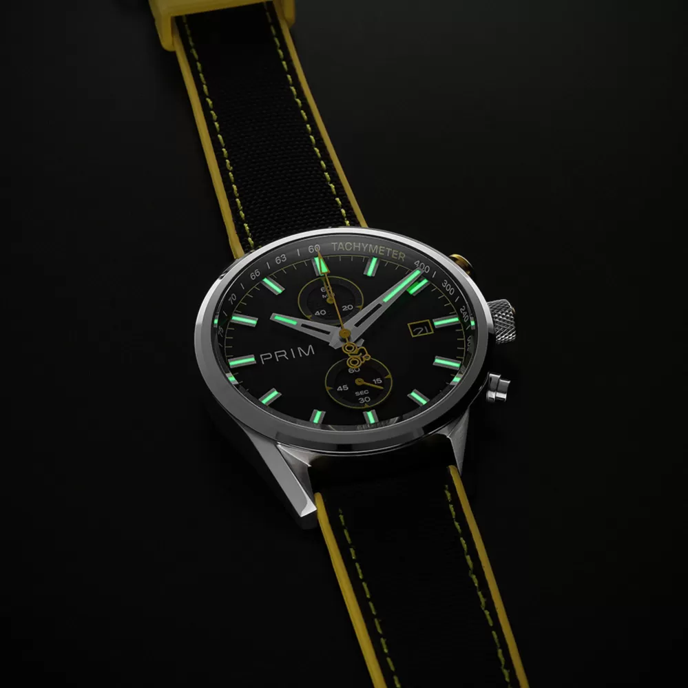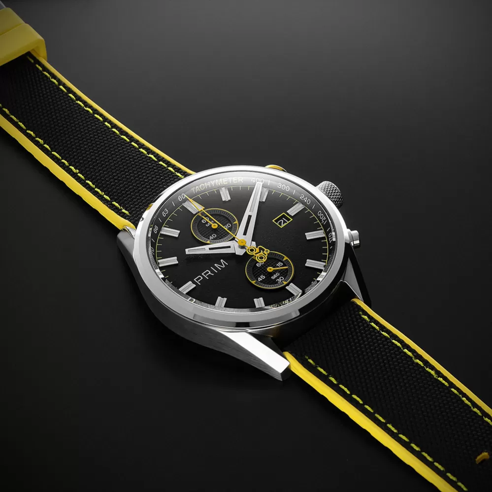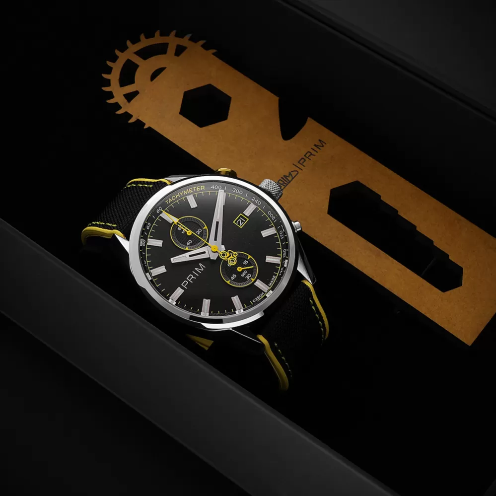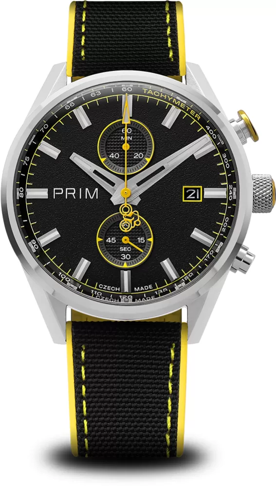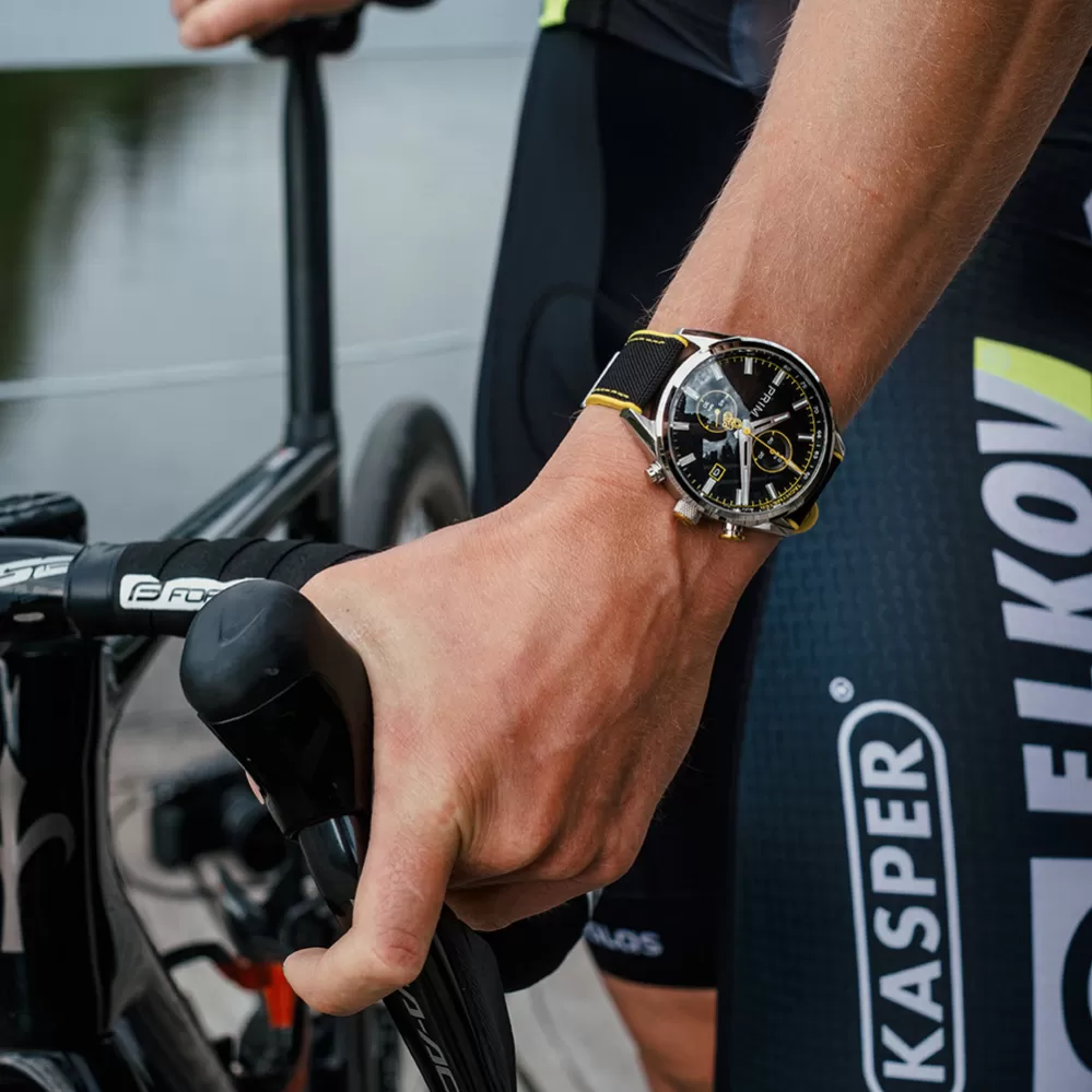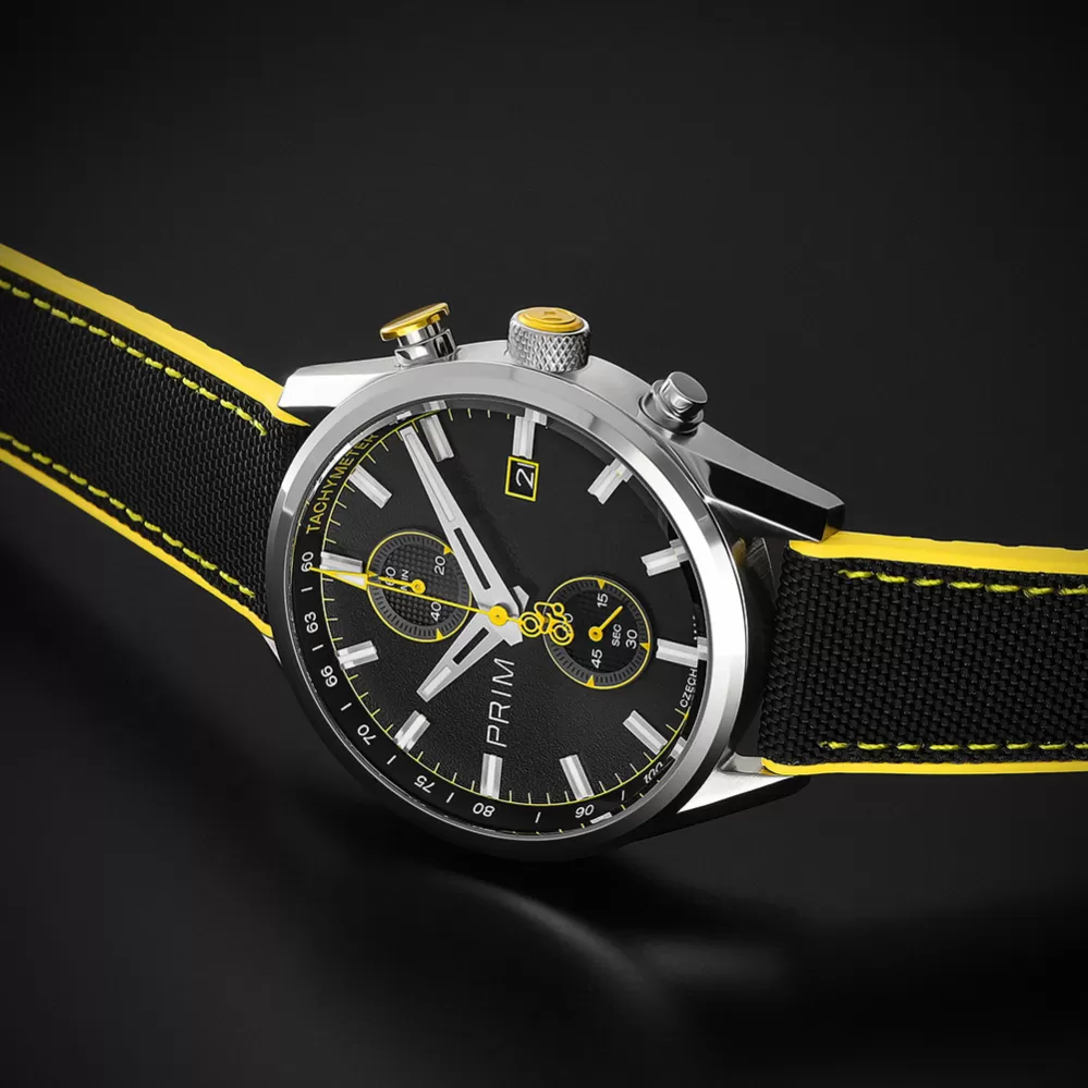 Limitovaná edice PRIM CYCLING vznikla ve spolupráci s profesionálním cyklokrosařem Michaelem Borošem jako pocta rychlosti, přesnosti a vytrvalosti. Hodinky mají japonský quartzový strojek Miyota 6S11, který umožňuje měření času až do 60 minut s přesností na 1/4 sekundy. Ciferník s karbonovým dekorem a luminiscenčními prvky zajišťuje výbornou čitelnost i při zhoršených světelných podmínkách. Sportovní vzhled podtrhuje hybridní řemínek z materiálu Sailcloth FKM, který je odolný, hypoalergenní a komfortní i při vysoké zátěži. Barevně odlišená tlačítka chronografu reflektují jednotlivé edice, zatímco subciferník a datumovka doplňují praktické funkce modelu. Edice je limitována na 200 kusů – 50 od každé varianty – s individuálním číslováním.