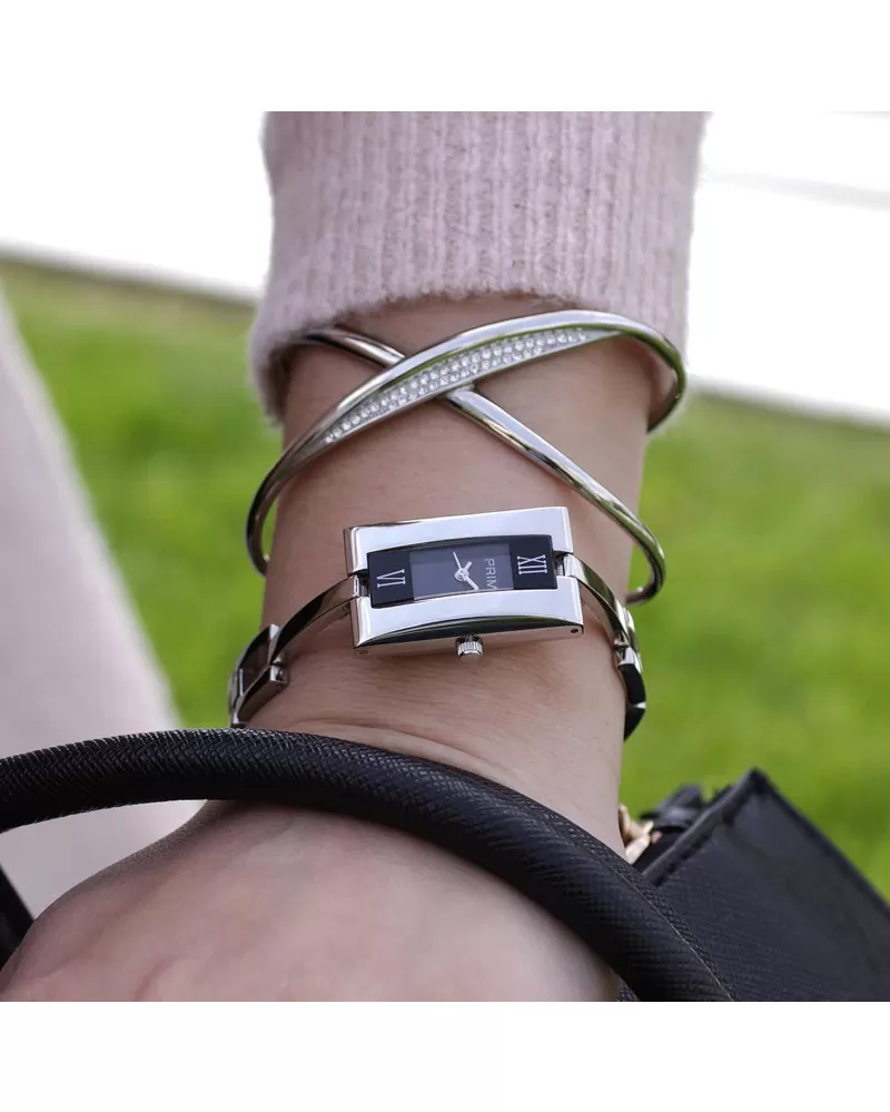 Úchvatné dámské hodinky značky Prim zaujmou ženy a dívky, které si potrpí na moderní doplňky. Hodinky jsou celé z ušlechtilé nerezové oceli, která je leštěná do vysokého lesku. Hranaté pouzdro je u tohoto modelu dominantní, má černý ciferník s římskými číslicemi.