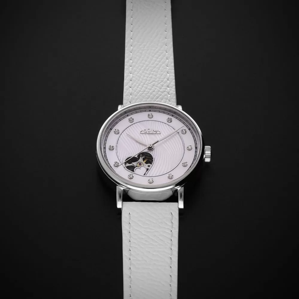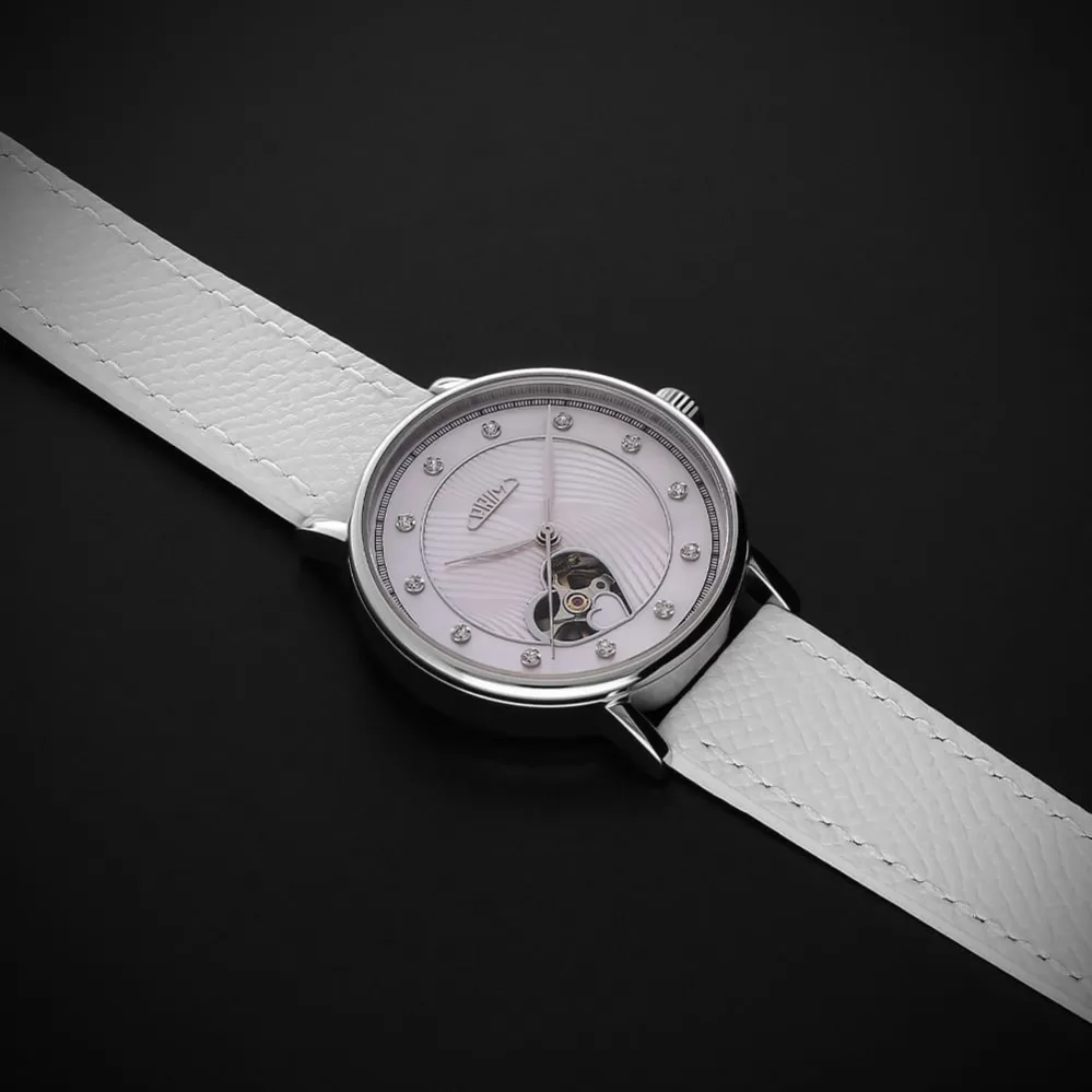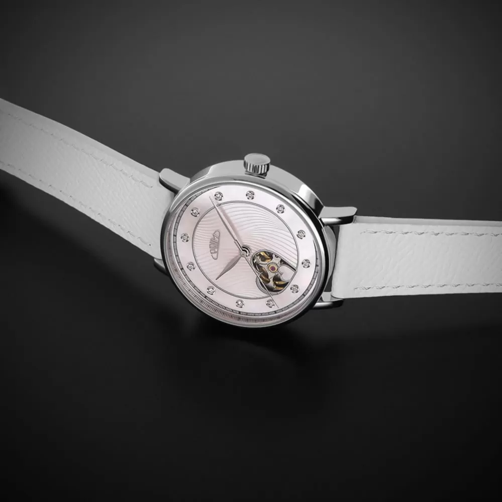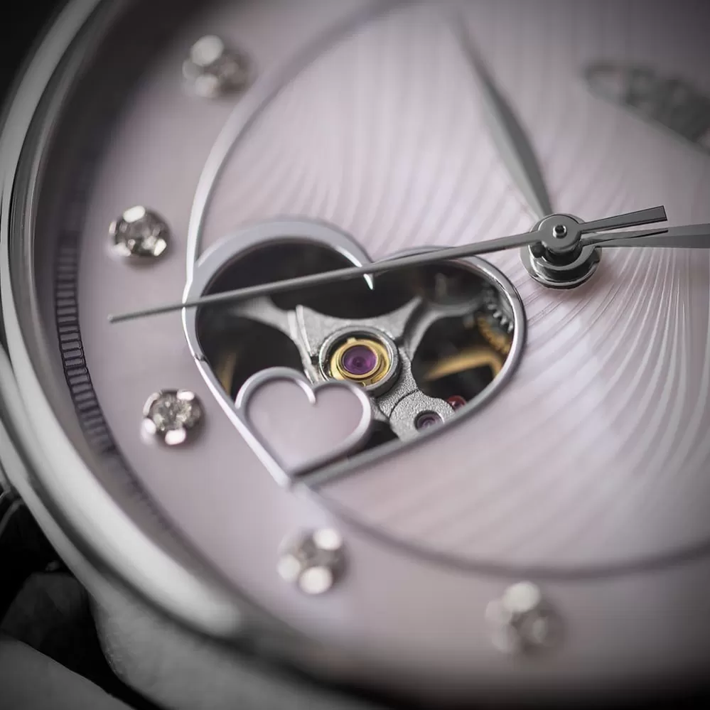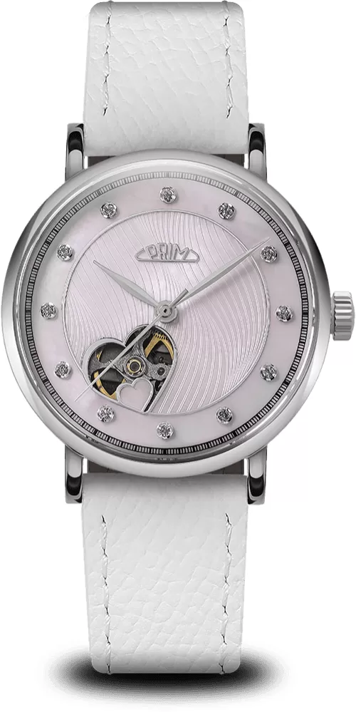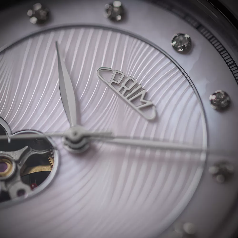 Objevte kouzlo PRIM Lady Love Elegant – dámských automatických hodinek, které spojují technickou preciznost s jemnou krásou krystalů Swarovski®. Jejich dominantou je průzor ve tvaru dvojitého srdce, symbolizující spojení elegance a emocí. Pouzdro z leštěné nerezové oceli 316L ukrývá japonský automatický strojek Miyota 82S0 s rezervou chodu až 42 hodin. Pod safírovým sklíčkem s antireflexní úpravou se nachází perleťový číselník s plastickou texturou a aplikovanými indexy zdobenými krystaly Swarovski®. Model je dostupný s ručně šitým koženým řemínkem nebo ocelovým tahem, ladícím k barvě pouzdra. PRIM Lady Love Elegant je dokonalým spojením ženské jemnosti, stylu a hodinářského umění.