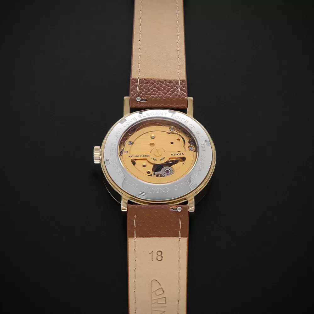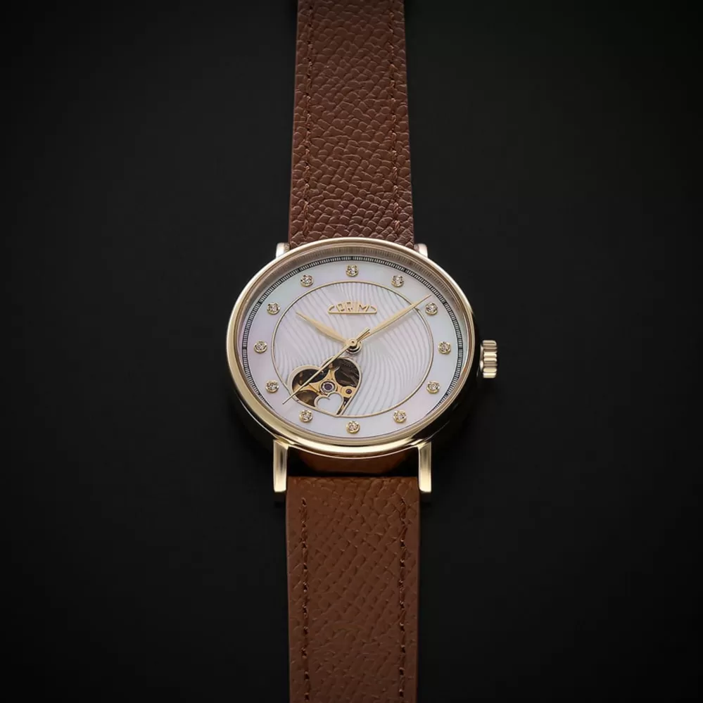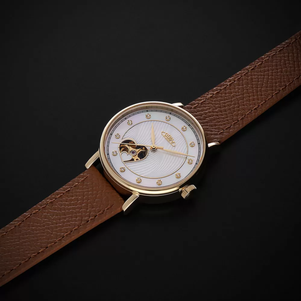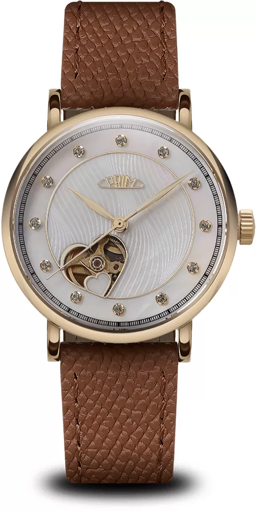 Objevte kouzlo PRIM Lady Love Elegant – dámských automatických hodinek, které spojují technickou preciznost s jemnou krásou krystalů Swarovski®. Jejich dominantou je průzor ve tvaru dvojitého srdce, symbolizující spojení elegance a emocí. Pouzdro z leštěné nerezové oceli 316L ukrývá japonský automatický strojek Miyota 82S0 s rezervou chodu až 42 hodin. Pod safírovým sklíčkem s antireflexní úpravou se nachází perleťový číselník s plastickou texturou a aplikovanými indexy zdobenými krystaly Swarovski®. Model je dostupný s ručně šitým koženým řemínkem nebo ocelovým tahem, ladícím k barvě pouzdra. PRIM Lady Love Elegant je dokonalým spojením ženské jemnosti, stylu a hodinářského umění.
