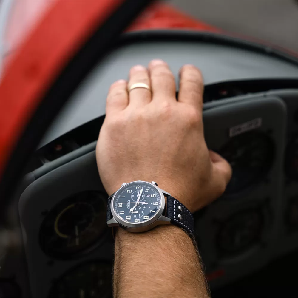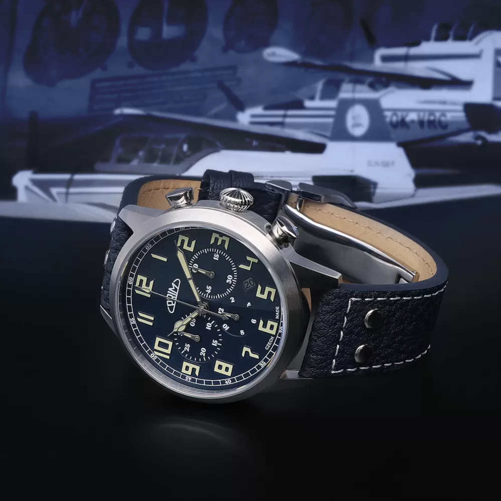 Exkluzivní pilot mechanické hodinky s chronografem a automatickým natahováním. Pouzdro je vyrobeno z ušlechtilé nerezové oceli 316L v kombinaci lesku a matu. Po úspěšné edici předchozího modelu, jsme se opět rozhodli použít strojek NE88A (Seiko), který ocení opravdoví znalci. Pilotské výrazné dynamické prvky jsou patrné na přední straně propracovaného číselníku. Pilot ručky a indexy jsou pokryté super lumini vrstvou a umožňují tak odpočet času při snížené viditelnosti. Hodinky jsou vybaveny kvalitním antireflexním safírovým sklem. Voděodolnost 10 ATM zaručuje vysokou odolnost i pro náročné zákazníky.