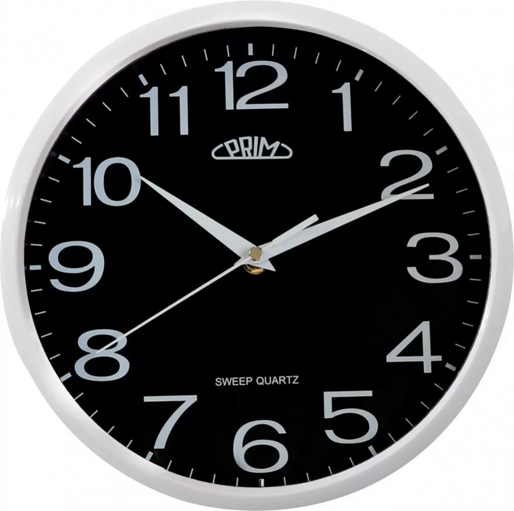 Klasické hodiny PRIM v čistém designu v plastovém provedení s arabskými číslicemi se strojkem s plynulým chodem.
