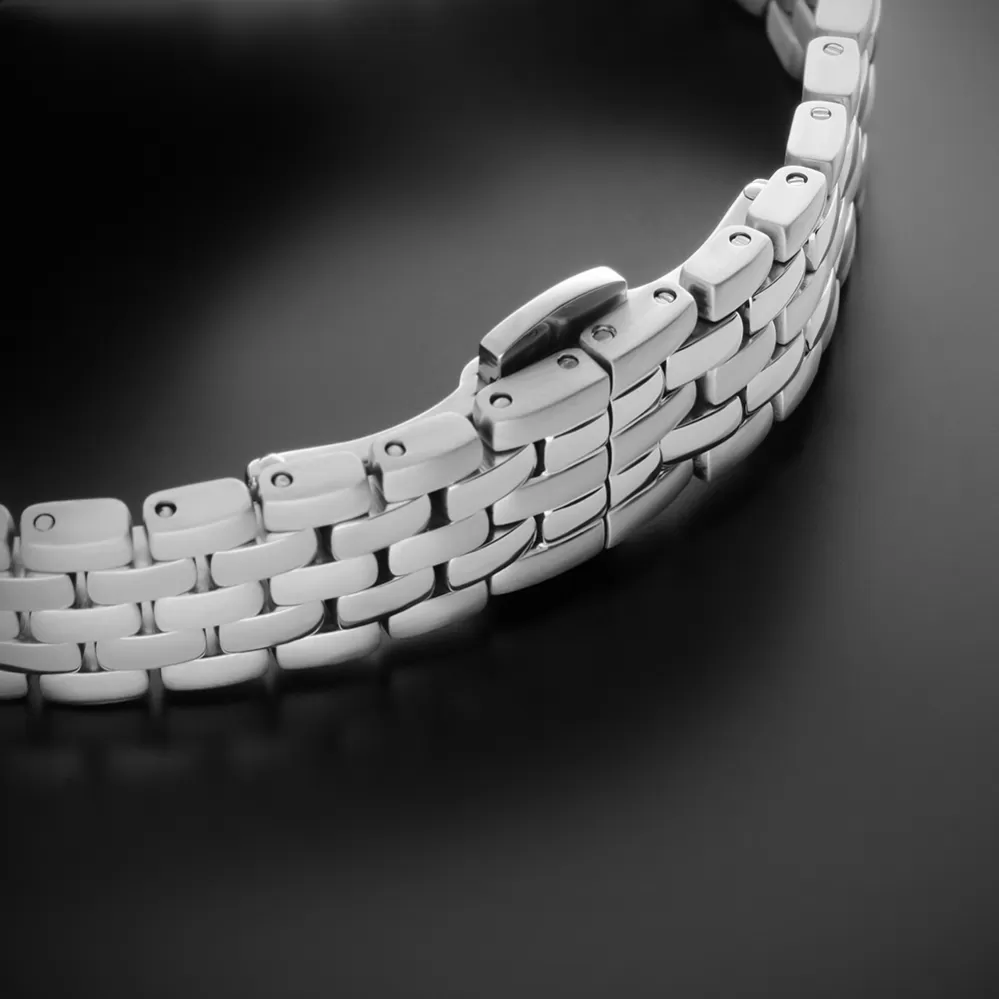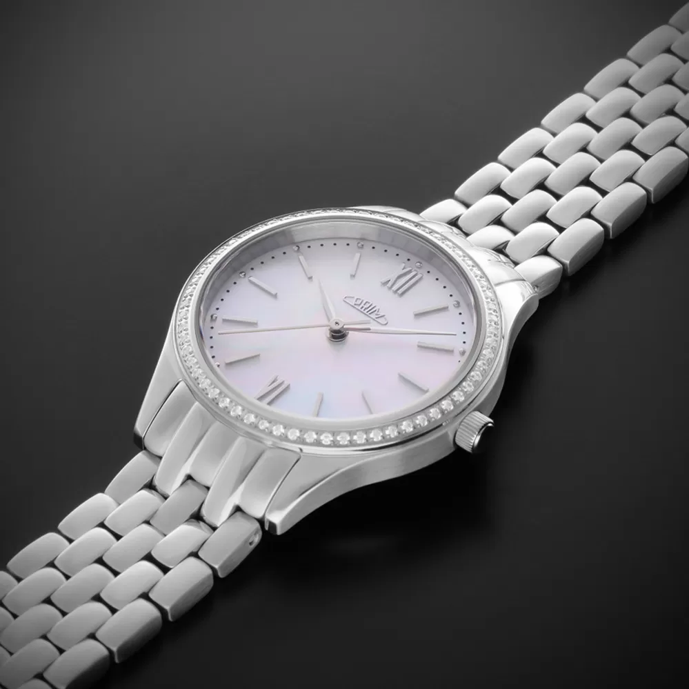 Dámské společenské hodinky PRIM Lyra jsou vyrobeny z ušlechtilé oceli 316L, kombinující lesk a brus pro elegantní vzhled. Perleťový číselník s fasovanými indexy a jemným minutovým čítačem je chráněn safírovým sklem s antireflexní a antitouch vrstvou. Voděodolnost 5 ATM zajišťuje odolnost při běžném používání, což činí tyto hodinky vhodné jak pro společenské příležitosti, tak pro každodenní nošení. K dispozici jsou různé barevné varianty od klasické stříbrné až po zlatou. Každý model je označen unikátním výrobním číslem v rámci limitované edice 200 kusů.