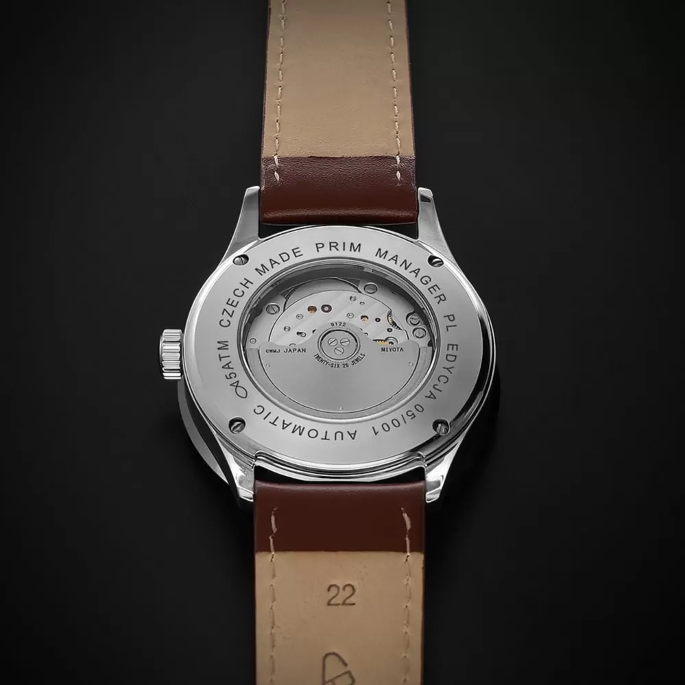 PRIM MANAGER 2025 je sportovně elegantní pánský model, který po deseti letech přináší novou generaci oblíbené řady s modernějším designem a technikou. Uvnitř tiká spolehlivý automatický kalibr MIYOTA 9122, chráněný pouzdrem z ušlechtilé oceli a safírovým sklíčkem s dvojitou antireflexní vrstvou. Moderní gradientní číselník s luminiscencí Super-LumiNova zaručuje skvělou čitelnost ve dne i v noci. Transparentní dýnko umožňuje nahlédnout na precizní chod strojku. Model je dostupný v několika barevných variantách s koženým řemínkem a nabízí vodotěsnost 5 ATM.
