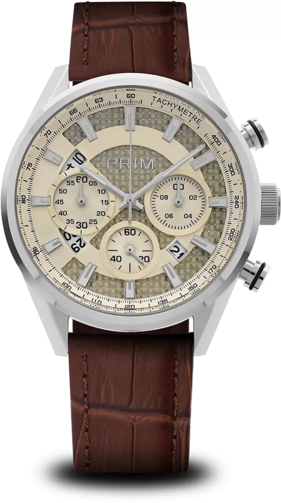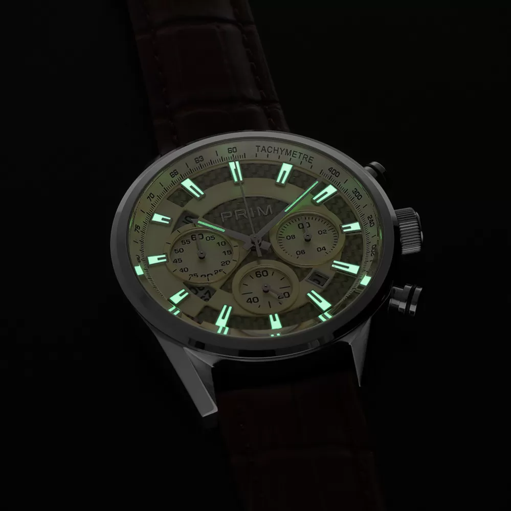 Model PRIM Master 25 spojuje sportovní dynamiku s nadčasovou elegancí a díky uhlíkovému vláknu získává exkluzivní vzhled. Precizní quartzový strojek kalibr 6S20 s chronografem měří s přesností na 1/20 sekundy a umožňuje měření až do 59 minut a 59 sekund. Voděodolnost 10 ATM a šroubovací korunka zajišťují spolehlivou ochranu proti vodě i při intenzivnějším používání, avšak tlačítka chronografu nejsou šroubovací a nedoporučuje se dálkové plavání či potápění. Pod vypouklým safírovým sklíčkem se nachází unikátní dvojitý číselník s karbonovým podkladem a paprskovitým efektem, doplněný luminiscenčními ručičkami a indexy. Model doplňuje kvalitní kožený řemínek s prošitím a každý kus má své jedinečné výrobní číslo.