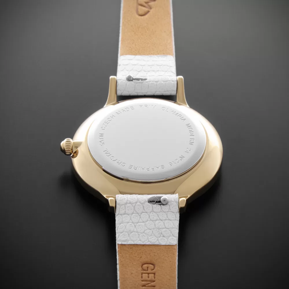 Nadčasová elegance spojena s jemnou krásou. Nový model dámských hodinek PRIM Olympia Modern. Hodinky, které uchvátí svým originálním ciferníkem a jemným zpracováním. Dámské hodinky s oblíbeným perleťovým ciferníkem, který vytváří originální odlesky. Elegantní design, zdobený jemnými detaily a vyrobený z kvalitních materiálů, dodává těmto hodinkám unikátní šarm. Hodinky jsou vyrobeny z ušlechtilé oceli. Voděodolnost 5 ATM zaručuje odolnost proti vodě při běžném používání. Dámy zaujme texturovaný perleťový číselník s fasovanými indexy na pozici 12,3,6 a 9. Safírové sklo s antitouch a antireflexní vrstvou je u tohoto dámského modelu samozřejmostí. Vybrat si můžete z mnoha barevných provedení s populárním jubilee tahem nebo koženým řemínkem s uchycením "quick release" systémem pro snadné vyměnění řemínku.
