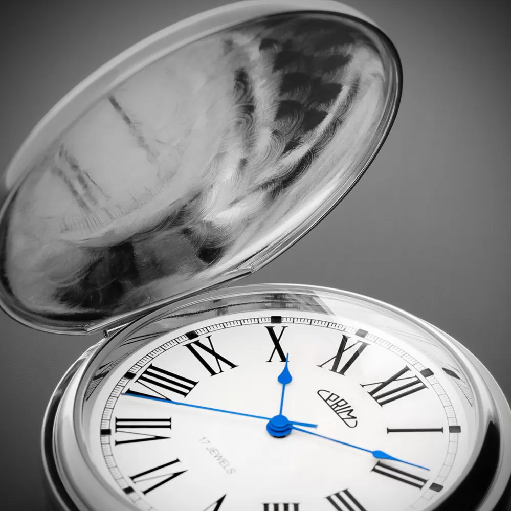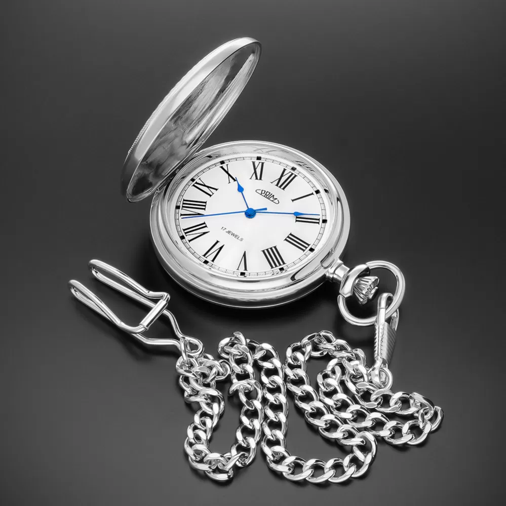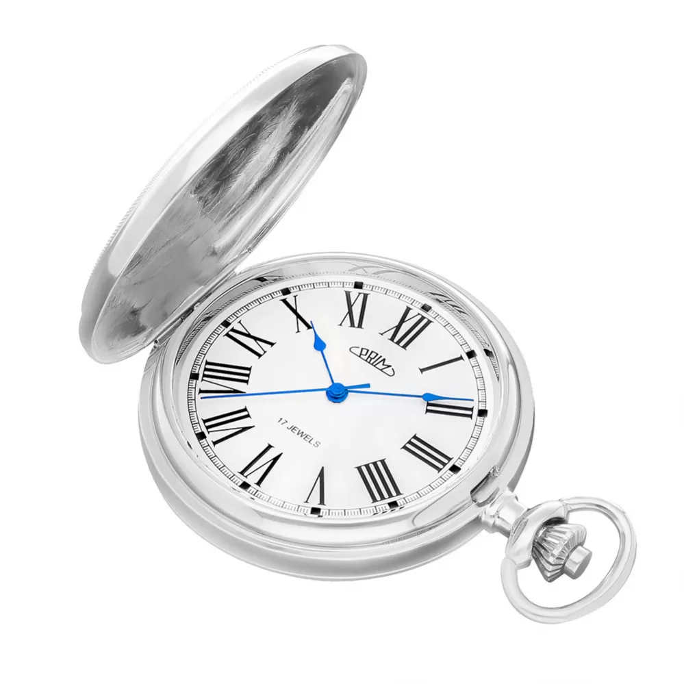 Klasické mechanické kapesní hodinky PRIM s ručním nátahem s římskymi číslicemi. Nově navržený plášť hodinek zdobí symbol českého znaku, tedy dvouocasý lev doplněný erbem, který se perfektně hodí k individualizaci monogramu. Hodinky jsou dodávány s nerezovým řetízkem. Rozměry 50 x 68 x 14 mm