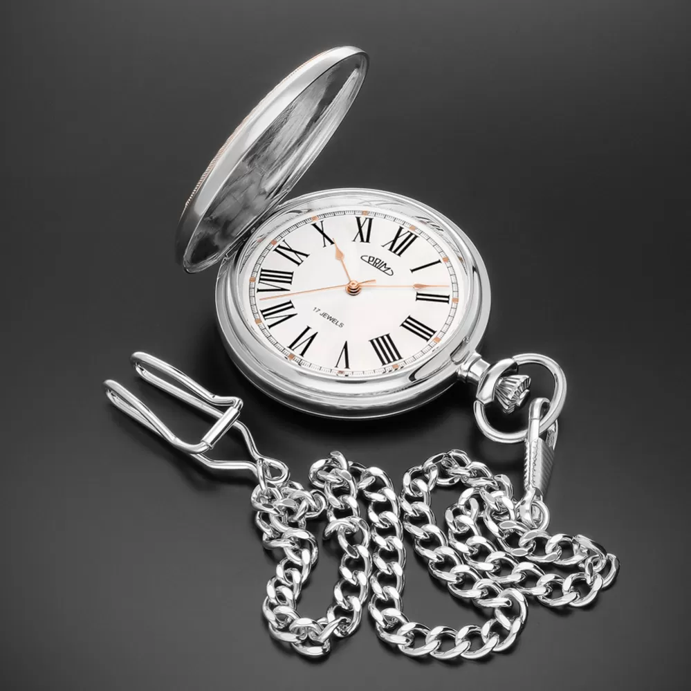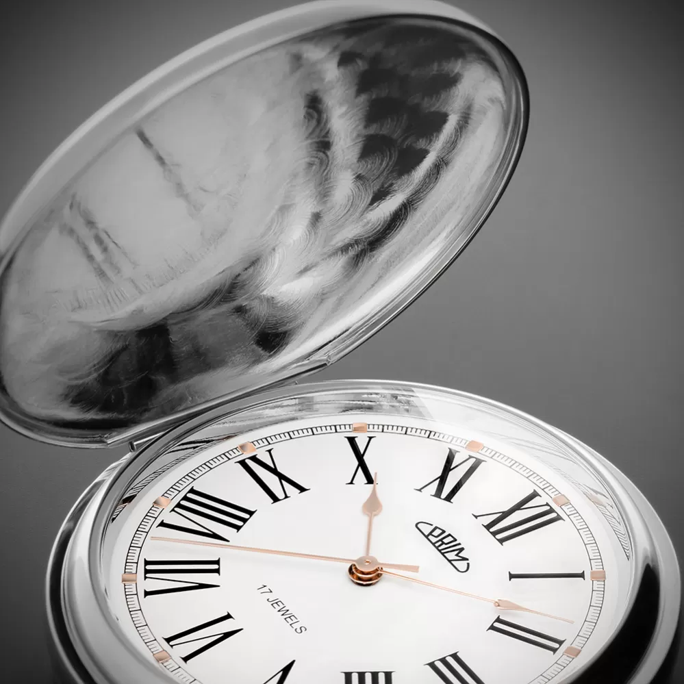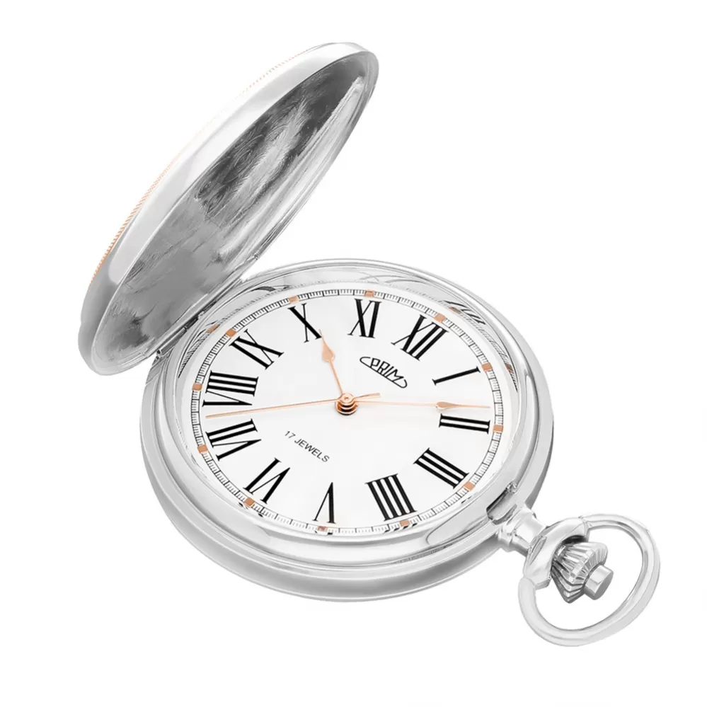 Klasické mechanické kapesní hodinky PRIM s ručním nátahem s římskymi číslicemi. Nově navržený plášť hodinek zdobí symbol českého znaku, tedy dvouocasý lev doplněný erbem, který se perfektně hodí k individualizaci monogramu. Hodinky jsou dodávány s nerezovým řetízkem. Rozměry 50 x 68 x 14 mm.