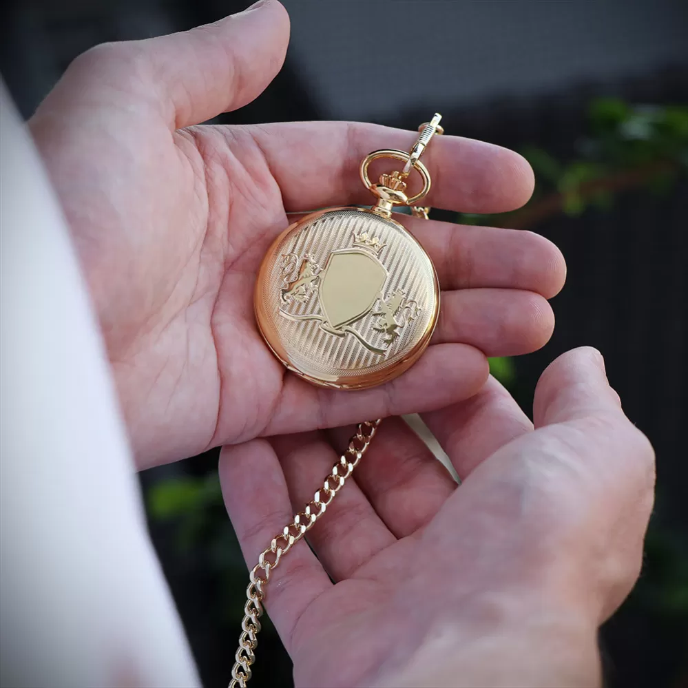 Klasické mechanické kapesní hodinky PRIM s ručním nátahem s římskymi číslicemi. Nově navržený plášť hodinek zdobí symbol českého znaku, tedy dvouocasý lev doplněný erbem, který se perfektně hodí k individualizaci monogramu. Hodinky jsou dodávány s nerezovým řetízkem. Rozměry 50 x 68 x 14 mm.