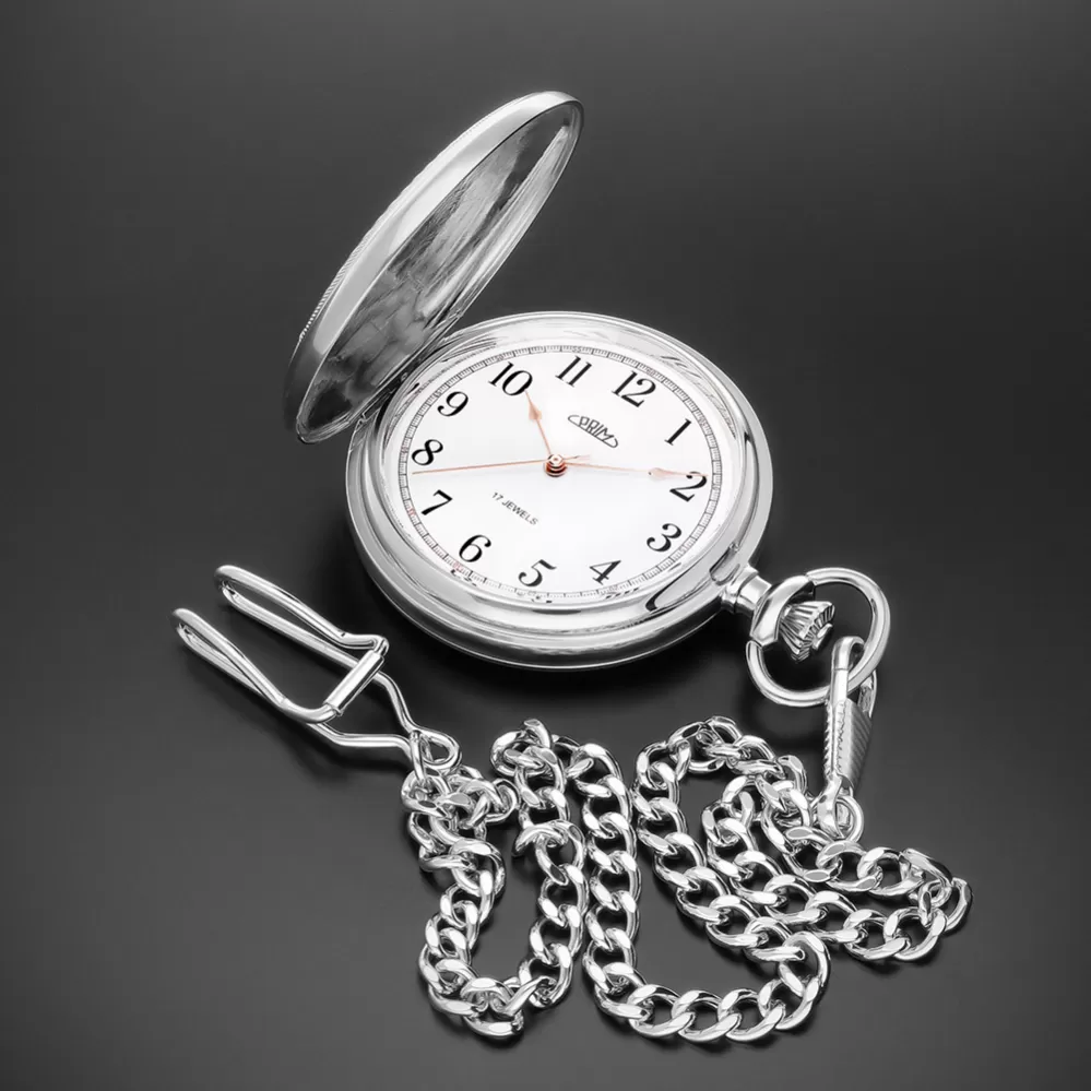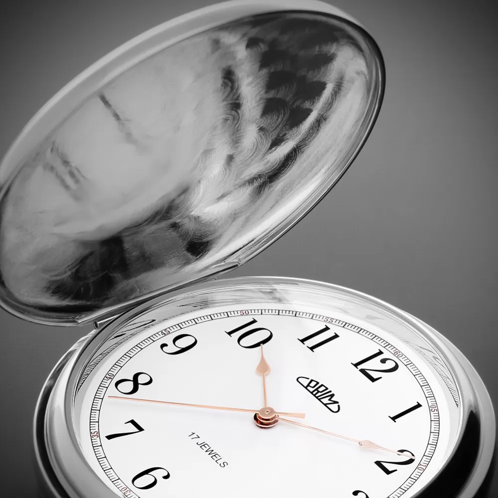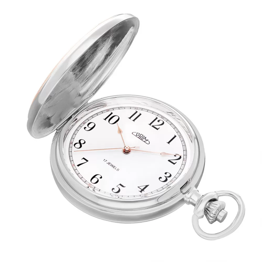 Klasické mechanické kapesní hodinky PRIM s ručním nátahem s arabskými číslicemi. Nově navržený plášť hodinek zdobí symbol českého znaku, tedy dvouocasý lev doplněný erbem, který se perfektně hodí k individualizaci monogramu. Hodinky jsou dodávány s nerezovým řetízkem. Rozměry 50 x 68 x 14 mm.