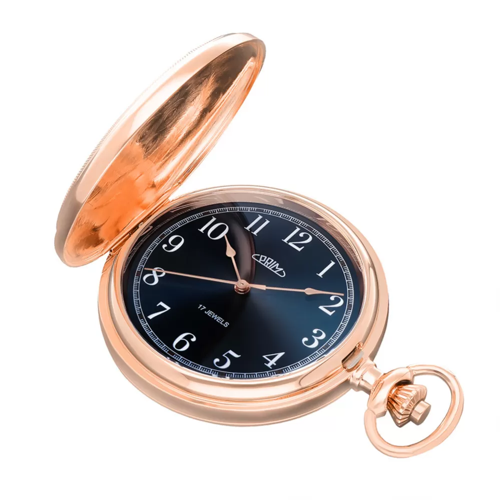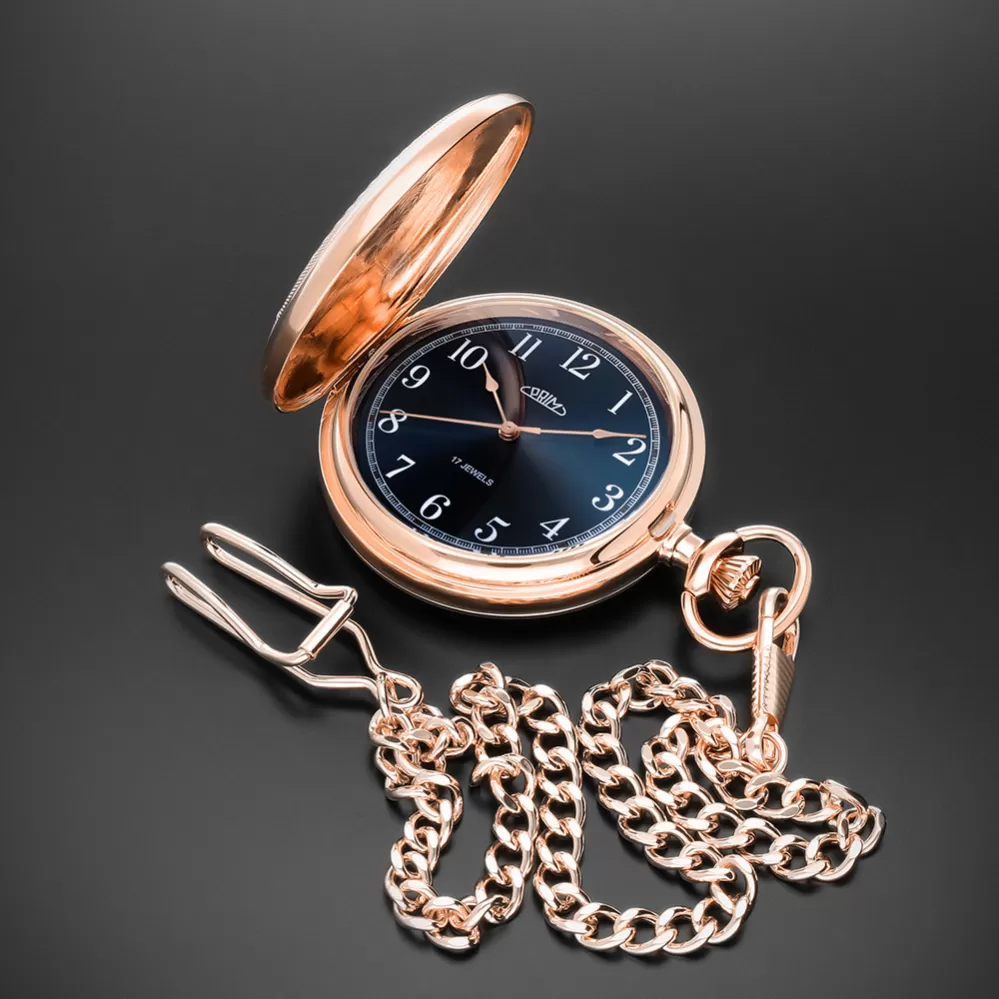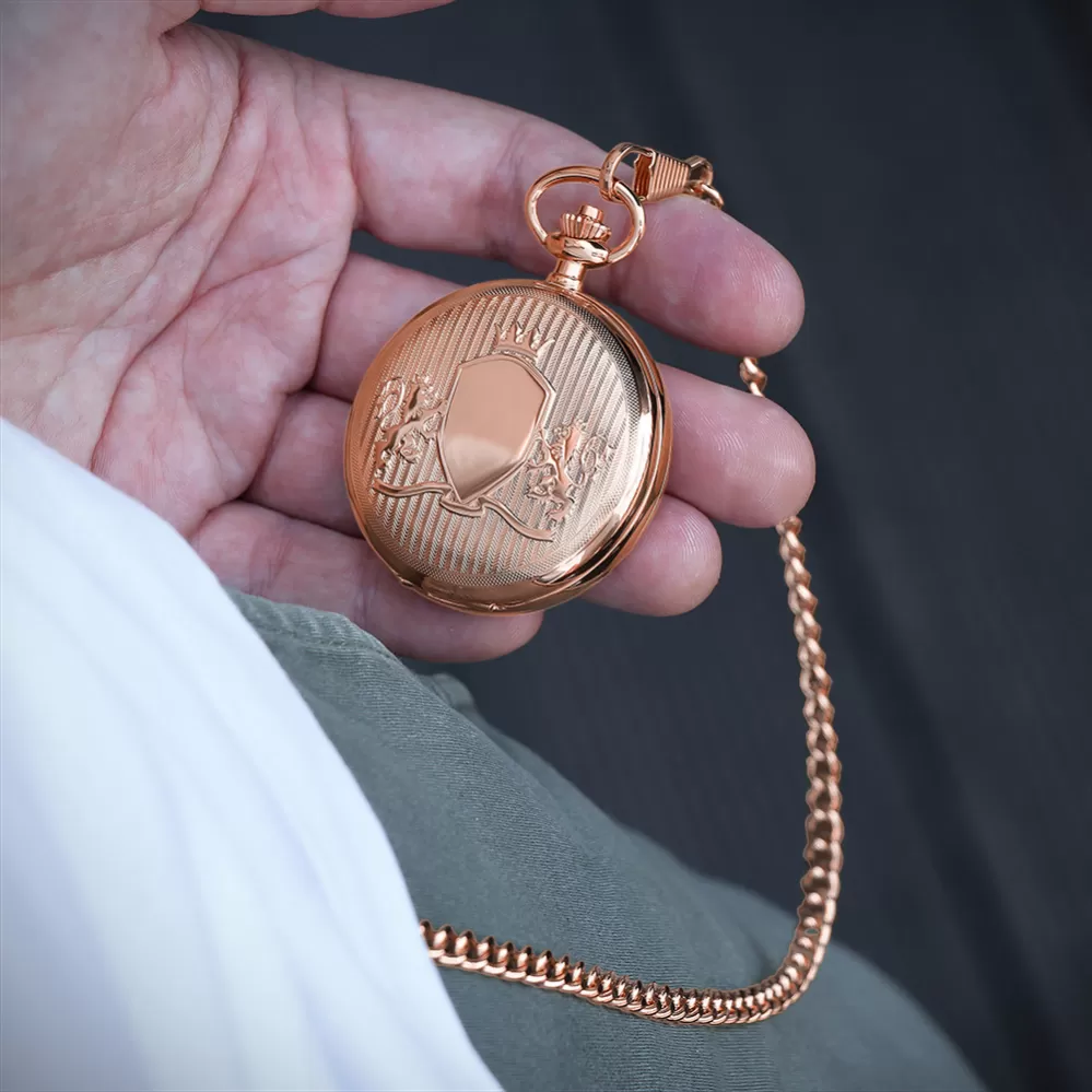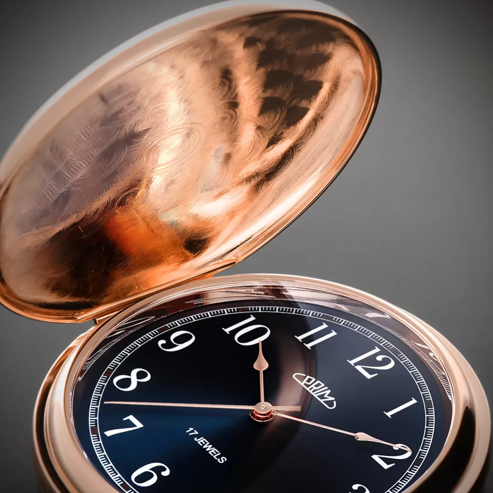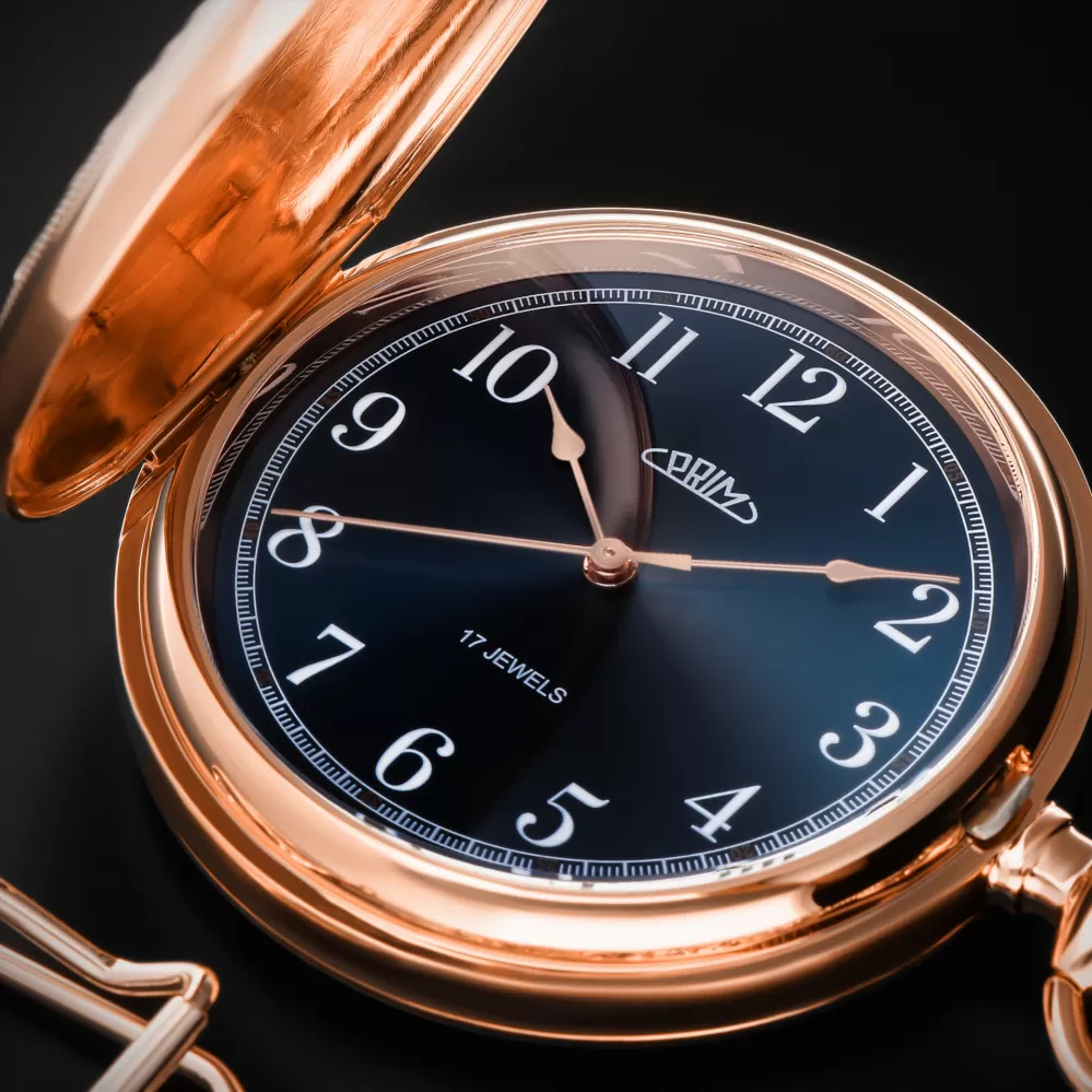 Klasické mechanické kapesní hodinky PRIM s ručním nátahem s arabskými číslicemi. Nově navržený plášť hodinek zdobí symbol českého znaku, tedy dvouocasý lev doplněný erbem, který se perfektně hodí k individualizaci monogramu. Hodinky jsou dodávány s nerezovým řetízkem. Rozměry 50 x 68 x 14 mm.
