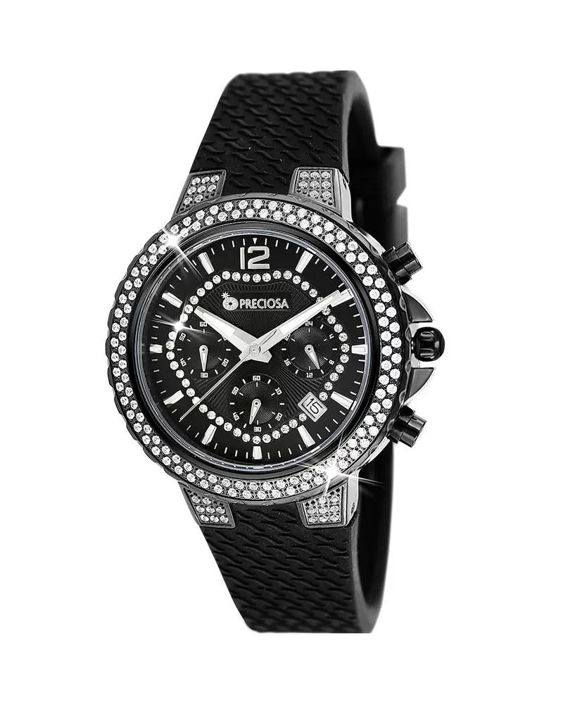 Stylové dámské chronografy představují vrcholný styl modelů Preciosa a kromě nápaditého vzhledu jsou kombinací špičkových materiálů a moderního vzorovaného řemínku, který je proveden v antialergenním silikonu. Pouzdro je vyrobeno z ušlechtilé oceli 316L upravené leštěním do vysokého lesku. Zdobení pouzdra kubickou zirkonií PRECIOSA je provedeno CNC technologií, kdy jsou krystaly fasovány do ocelového pouzdra.