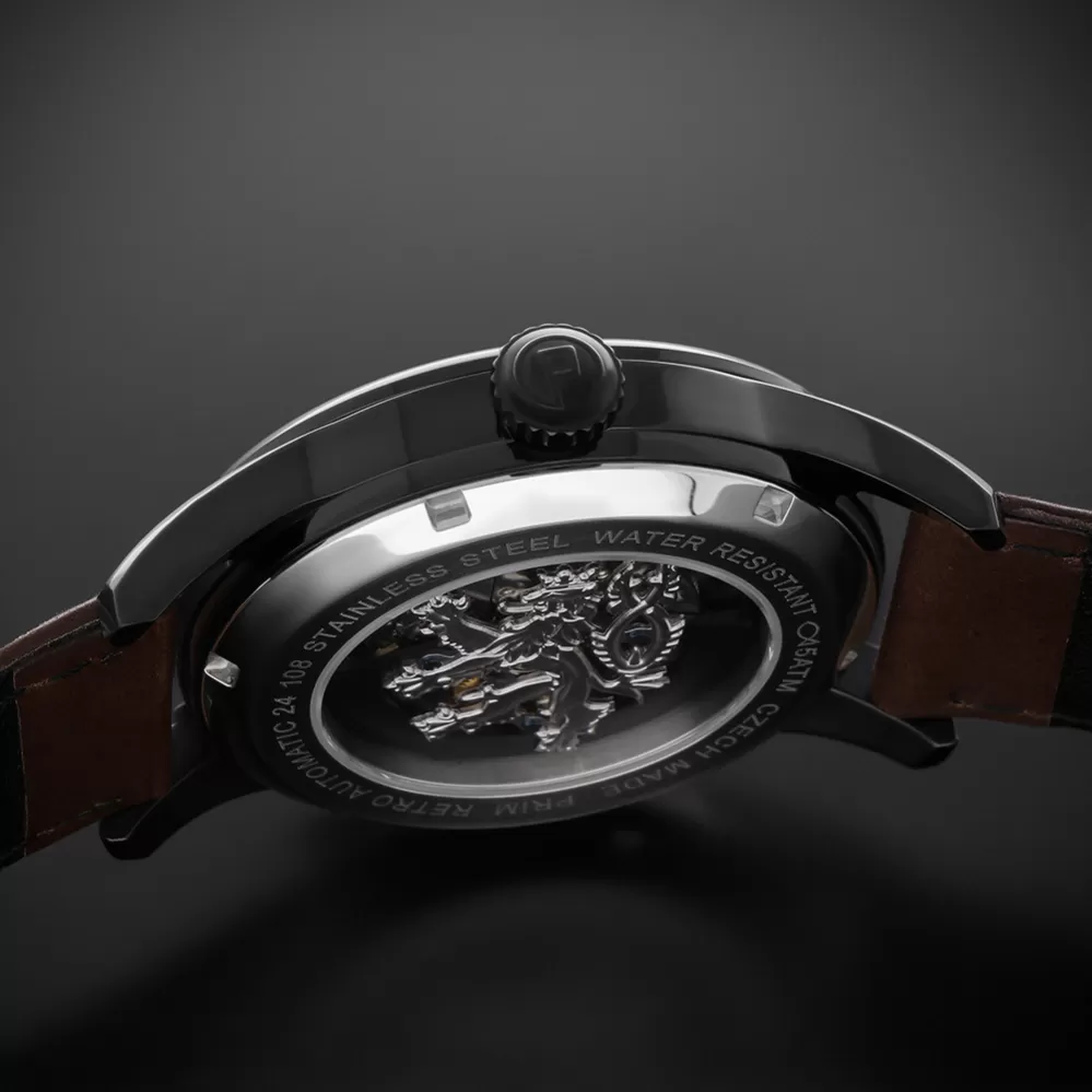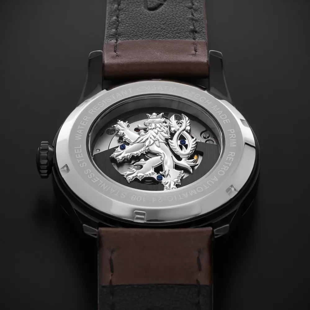 Představujeme vám automatické hodinky PRIM Retro Automatic 24, které spojují moderní retro design s elegancí a kvalitou. Tento model zaujme originálním 3D rotorem PRIM se symbolem lva a netradičním kulatým zobrazením data na pozici 3 hodiny, což perfektně doplňuje minimalistický vzhled. Pouzdro z nerezové oceli 316L je dostupné ve stříbrné, IP černé a zlaté barvě, s průzorem na zadním víčku. Hodinky disponují retro číselníkem s indexy a čísly, voděodolností 5 ATM a sekundovou ručičkou, která harmonizuje s celkovým designem. Kvalitní kožený řemínek s designovou sponou na trn přidává na komfortu a stylu. Na vývoji unikátního rotoru studio PRIM pracovalo přes 8 měsíců, což podtrhuje jedinečnost tohoto modelu. Dodávány jsou v elegantní krabičce s návodem, záručním listem a individuálním výrobním číslem.