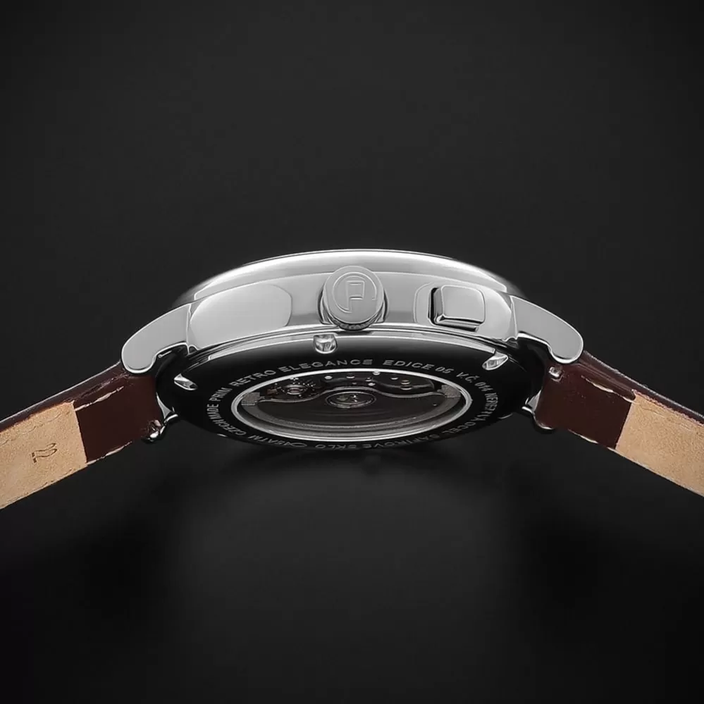 PRIM Retro Elegance 25 jsou elegantní pánské hodinky, které spojují klasický design s moderním zpracováním. Automatický kalibr Miyota 9120 zajišťuje přesný a plynulý chod, zatímco vypouklé safírové sklíčko s antireflexní vrstvou podtrhuje retro styl číselníku. Průhledné dýnko umožňuje nahlédnout do precizní práce mechanického strojku. Větší ocelové pouzdro dodává modelu výraznější charakter a osobitý vzhled. Hodinky jsou dostupné v několika barevných variantách s koženým řemínkem a vodotěsností 5 ATM, díky čemuž se hodí jak pro každodenní nošení, tak pro společenské příležitosti.