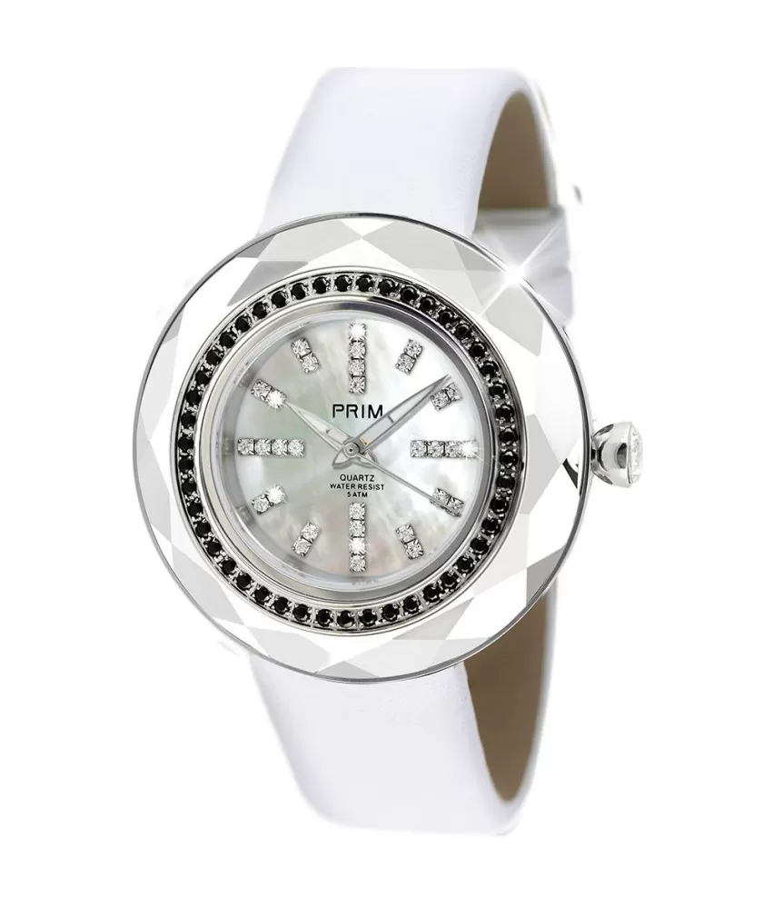 Luxusní model hodinek Prim z kolekce Prim Preciosa Onyx White si zamilujete. Pouzdro hodinek je vyrobené z ušlechtilé oceli 316L a je leštěné do vysokého lesku. Okruží hodinek je vyrobené  z ručně opracovaného pečeného přírodního onyxu a osázené je dokola černými zirkony. Ciferník je perleťové barvy s indexy, které jsou vysázeny zářivými zirkony bílé barvy. Řemínek tohoto modelu hodinek Prim je vyroben z bílé kůže, hodinky jsou na zápěstí velice příjemné.