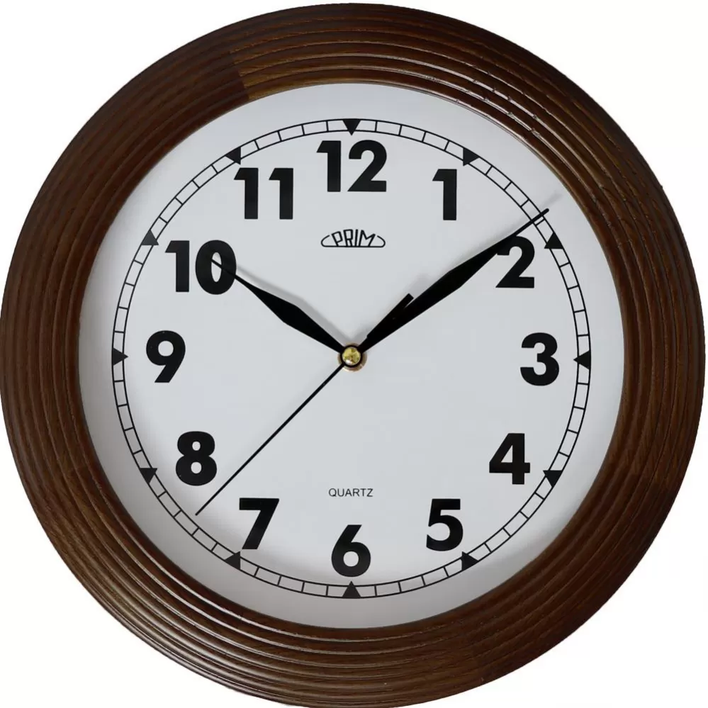 Klasické dřevěné hodiny PRIM s arabskými číslicemi.