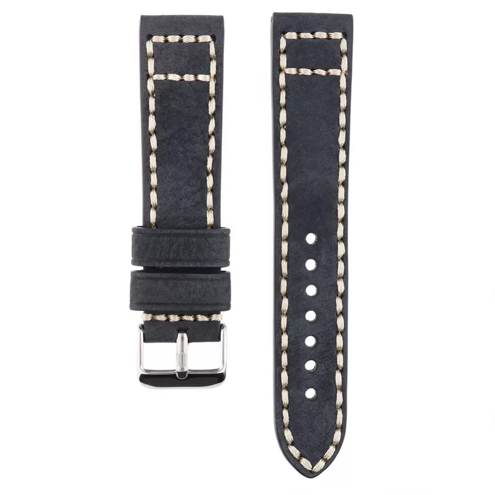 Kožený řemínek PRIM s výrazným ručním prošíváním a s klasickou stříbrnou sponou na trn.